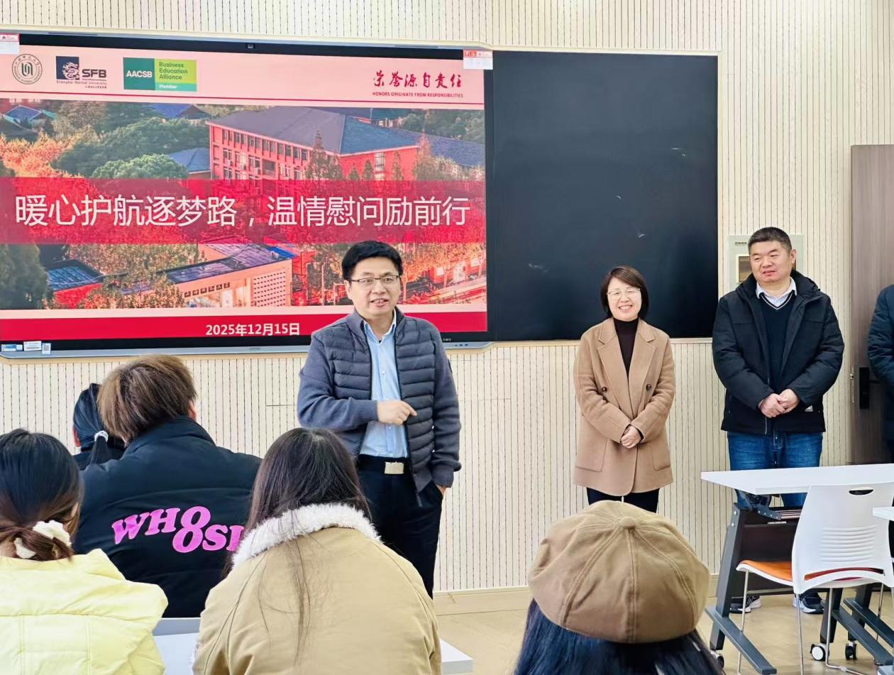 12月15日中午,商学院考研慰问会在学院A座305会议室举行。学院党委书记张春丽、院长刘江会及学院领导班子成员、毕业班辅导员共同出席,为正在备战考研的学子送上殷切祝福与暖心关怀。