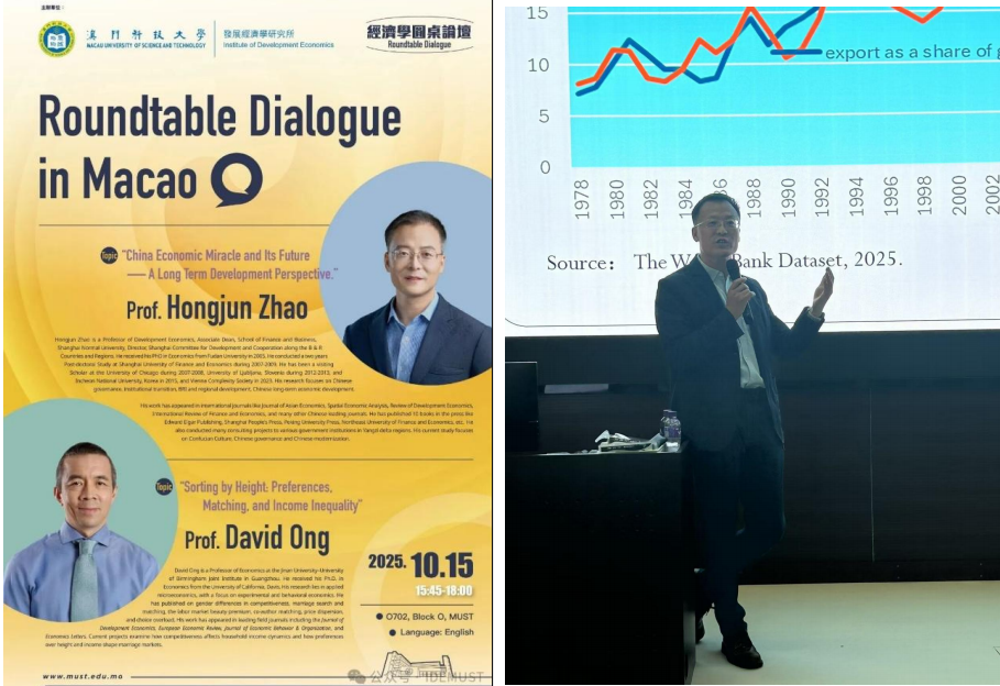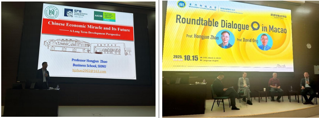 2025年10月14-15日,商学院副院长赵红军教授应澳门科技大学发展经济学研究所所长雷鼎鸣讲席教授邀请,与商学院姚沁讲师、程一诺研究生一同赴澳门出席经济学圆桌论坛。本次圆桌论坛由澳门科技大学发展经济学研究所主办,旨在汇聚国内外经济学领域的专家学者“共同推动经济学教育与研究的进步”。论坛形式包括主题演讲、嘉宾对话和观众互动环节,吸引了澳门科技大学200位师生与多位经济学研究学者的参与。