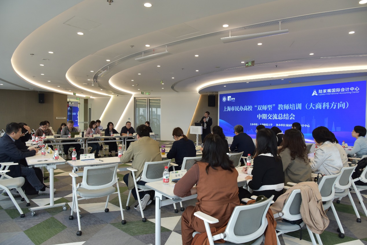 为深化产教融合,助力民办高校师资队伍建设,2025年10月27日,上海市民办高校“双师型”教师培训(大商科方向)中期总结交流会在陆家嘴国际会计中心顺利举行。本次会议由上海师范大学商学院主办,特邀上海师范大学教育学院教师发展中心常务副主任徐雄伟、上海建桥学院校长兼上海市民办教育协会副会长朱瑞庭、立信会计师事务所合伙人杨峰安,上海师范大学商学院院长刘江会、副院长姚亚伟、上海师范大学后勤管理中心副主任徐沁、行政总监蔡炜及校内指导老师代表张玉华教授、朱敏副教授、谭黎阳副教授、贾思雪副教授、郝亮副教授等嘉宾出席,同时来自上海市10所民办高校的21位培训学员参加会议。会议由商学院副院长姚亚伟主持。