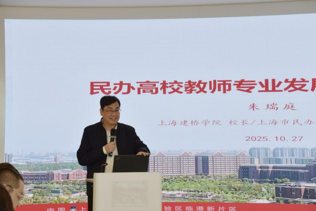 在交流会的主体环节,上海建桥学院朱瑞庭校长以“民办高校教师专业发展:困惑及路径”为主题,从民办高校教师的角色定位、当前面临的困惑、专业发展等方面与与会人员做了深度分享。朱校长提到,民办高校教师应始终坚持学科建设、专业建设和教师专业发展“三位一体”的重要性,同时主动适应高等教育发展新趋势,勇于在教学理念、方法和内容上不断创新,并将实践经验反哺教学,从而实现个人职业能力的全面提升。