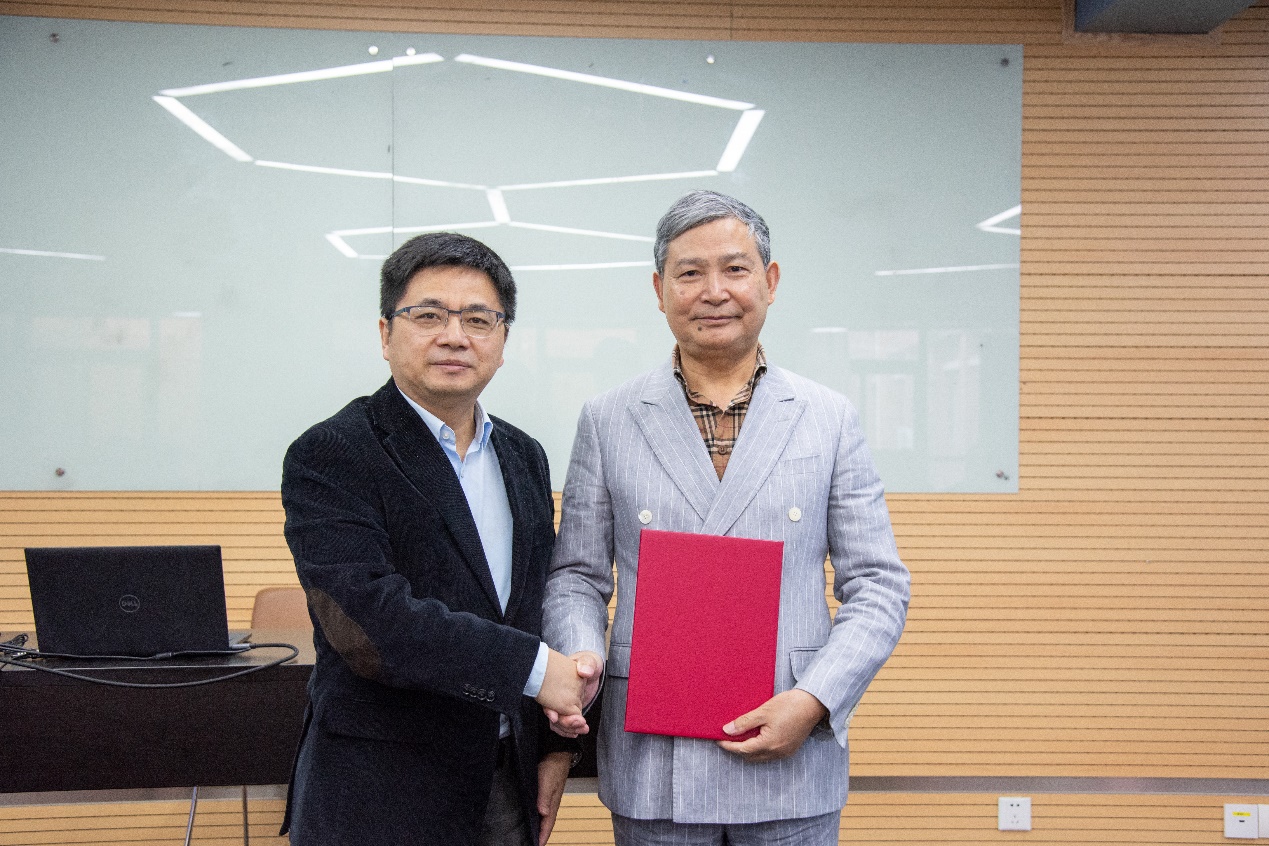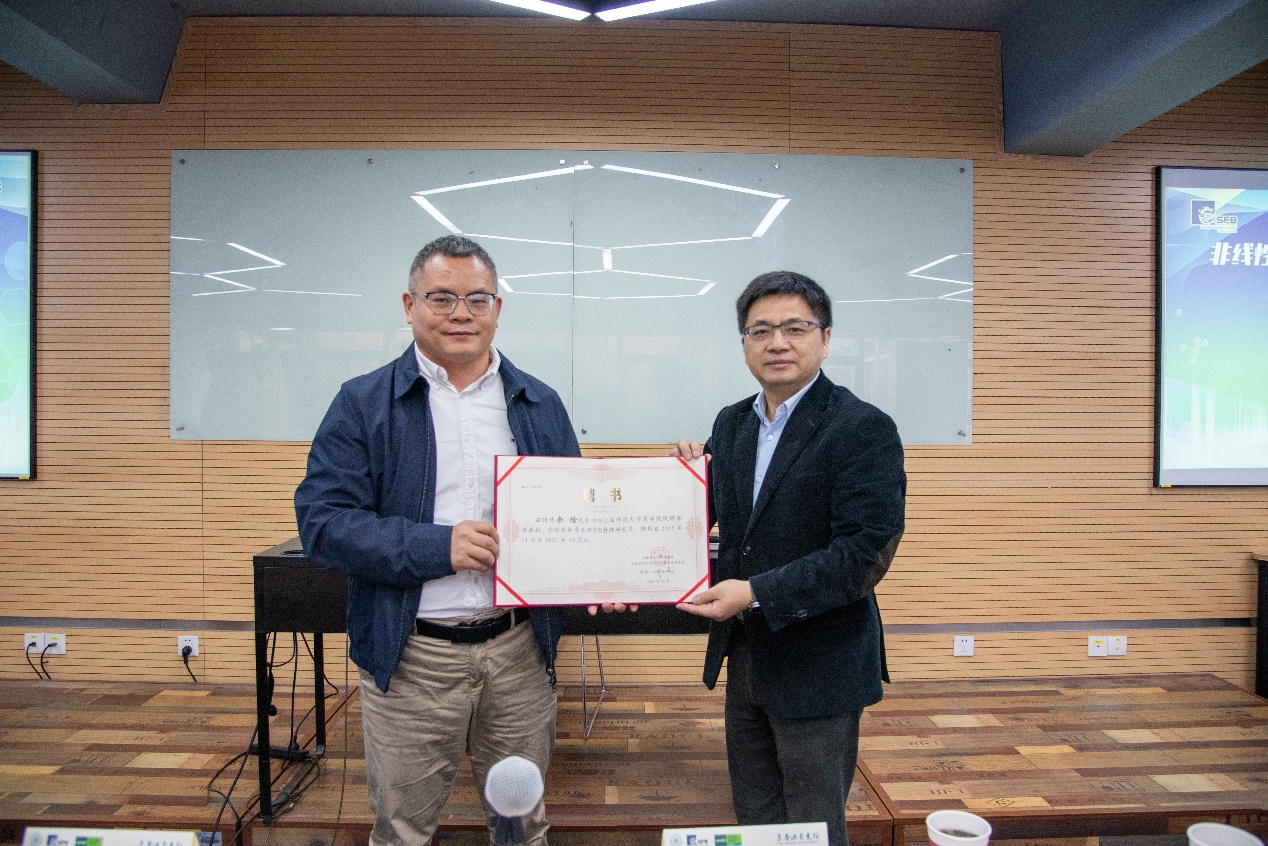 致辞后,会议举行专家聘任仪式。上海师范大学商学院聘任上海临港科创中心首席经济学家叶金龙先生、上海师范大学化材学院余焓教授为全球创新资本研究院特聘研究员,刘江会院长为两位专家颁发聘书。受聘代表余焓教授发言,介绍了其团队在氧化催化与材料科学领域的前沿研究及产业化应用前景,并呼吁校内外携手构建更加开放高效的科技成果转化环境与平台。