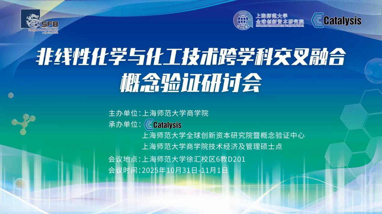 2025 年10月31日至11月1日,“非线性化学与化工技术跨学科交叉融合概念验证研讨会”在上海师范大学徐汇校区召开。本次会议由上海师范大学商学院主办,Catalysis 平台、上海师范大学全球创新资本研究院暨概念验证中心、上海师范大学商学院技术经济及管理硕士点联合承办,以“探索化学化工领域非线性现象,促进跨学科交叉融合与科技成果转化概念验证”为主题,汇聚了来自高校、科研院所、企业及投资机构的二十余位嘉宾,以及上海师范大学化学相关专业博士、技术经济及管理硕士研究生十余位,围绕多领域前沿议题展开深入交流。