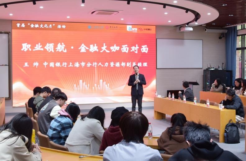开幕式结束后,“职业领航·金融大咖面对面”讲座随即举行。中国银行上海市分行党委组织部副部长、人力资源部副总经理王帅以“洞悉就业新形势,规划职业新未来”为主题,深入剖析了人工智能在银行招聘中的应用场景、测评逻辑与实战策略。他通过生动的案例解析与技巧分享,助力学生把握数字化招聘新趋势,有效提升就业竞争力。讲座现场气氛热烈,互动踊跃,为同学们提供了前沿、实用的职业发展指引。