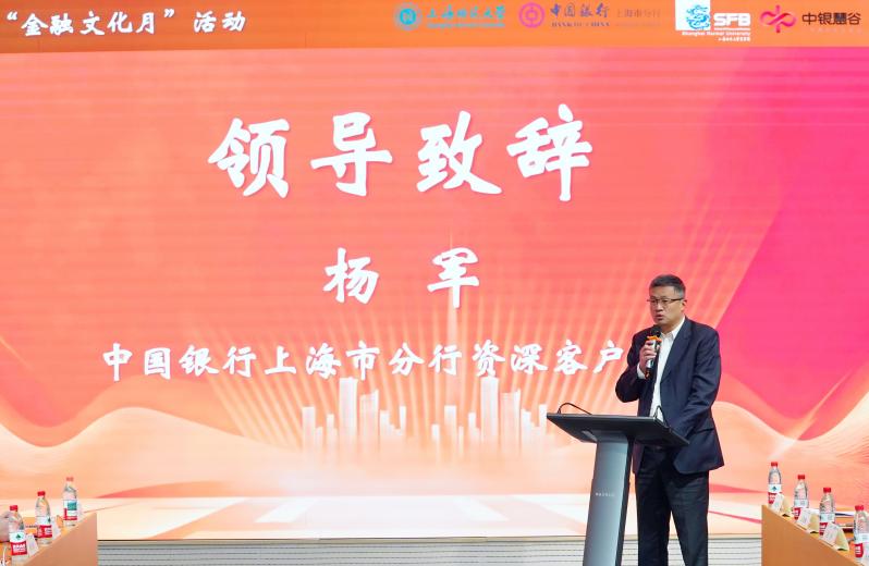 中国银行上海市分行资深客户经理杨军代表中国银行上海市分行对本次活动的顺利推进表示祝贺。他指出,上海师大始终以社会需求为导向,培育了大批知行合一的应用型人才。中国银行作为百年金融机构深耕上海国际金融中心建设,双方自2018年起深度合作,落地多个项目。此次金融文化月活动是双方深化产教融合的创新实践。中国银行将持续发挥资源优势,搭建从校园到职场的桥梁,助力学生成长为适配金融强国战略的高素质人才。