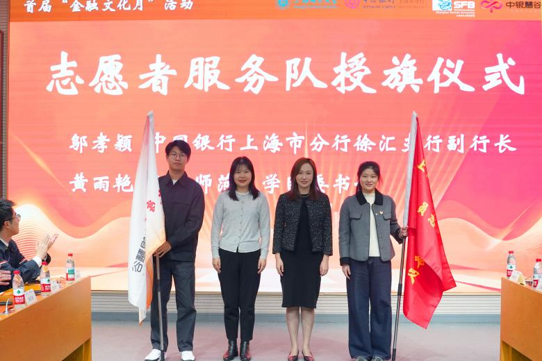 志愿服务队授旗仪式中,中国银行徐汇支行副行长邬孝颖和校团委负责人分别为党员志愿服务队与基地志愿服务队授旗,激励志愿者团队以专业服务践行公益使命。