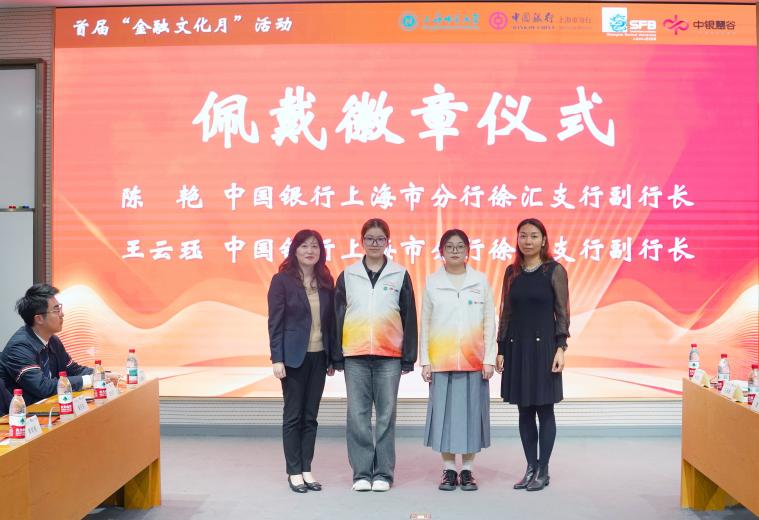 随后,中国银行徐汇支行副行长陈艳、王云珏为基地新成员佩戴实训徽章。这枚徽章由基地学生成员亲自设计,不仅是同学们在实训基地的职业身份象征,更意味着他们从学生到“准职业人”的身份转变。