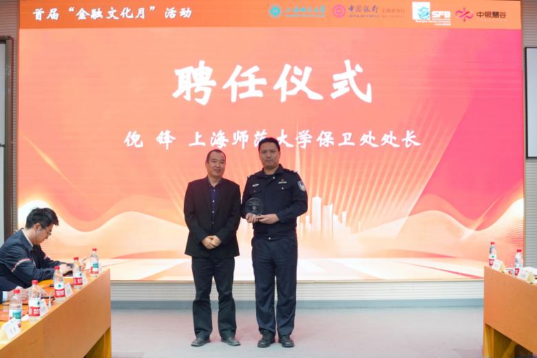 校保卫处负责人为沪西高校派出所副所长宣伯杰颁发“上海师范大学金融反诈教育校外辅导员”聘书,携手筑牢校园金融反诈防护网。