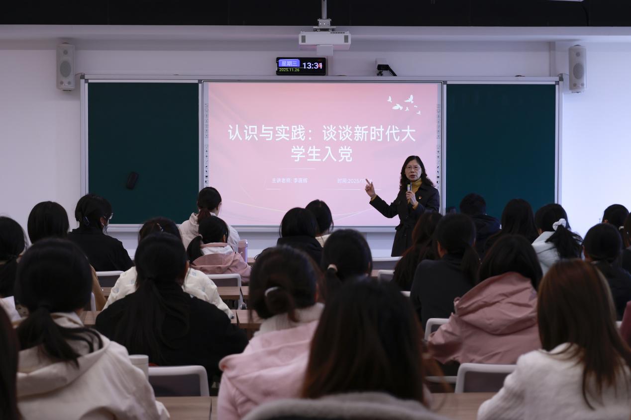 2025年11月26日13:30,上海师范大学商学院于奉贤校区大学生发展中心B座301教室举办入党积极分子专题培训。本次培训特邀我校马克思主义研究中心主任、国家三级教授李薇辉老师担任主讲嘉宾,围绕“认识与实践:谈谈新时代大学生入党”展开深入讲解。本次培训面向学院入党积极分子,旨在引导青年学子端正入党动机,坚定理想信念,以实际行动向党组织靠拢。