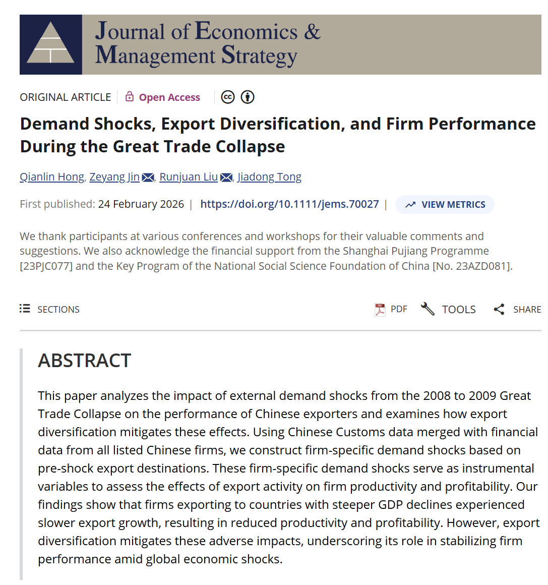 近日,上海师范大学商学院副教授金则杨作为共同通讯作者,与深圳证券交易所洪倩霖、加拿大阿尔伯塔大学刘润娟教授以及南开大学佟家栋教授(作者以字母顺序排序)的合作论文《Demand Shocks, Export Diversification,and Firm Performance During the Great Trade Collapse》已正式被国际经济学与管理学顶尖期刊《Journal of Economics & Management Strategy》(简称JEMS)录用并在线发表。
