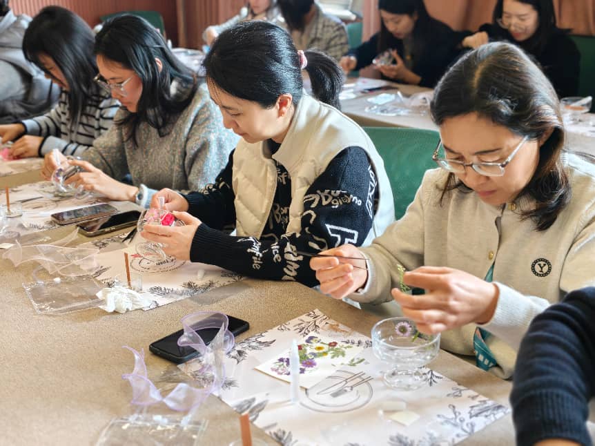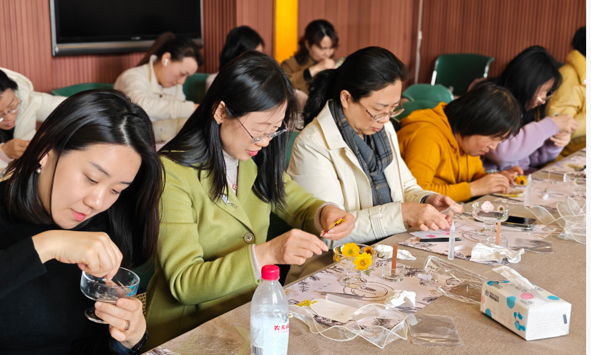 本次活动巧妙融入商学特色。精油选择环节,柠檬精油代表“活力创新”、薄荷精油象征“理性严谨”,契合学院的人才培养目标;押花创作时,女教工们用尤加利叶、洋甘菊等花材进行创意表达对学院的热爱。