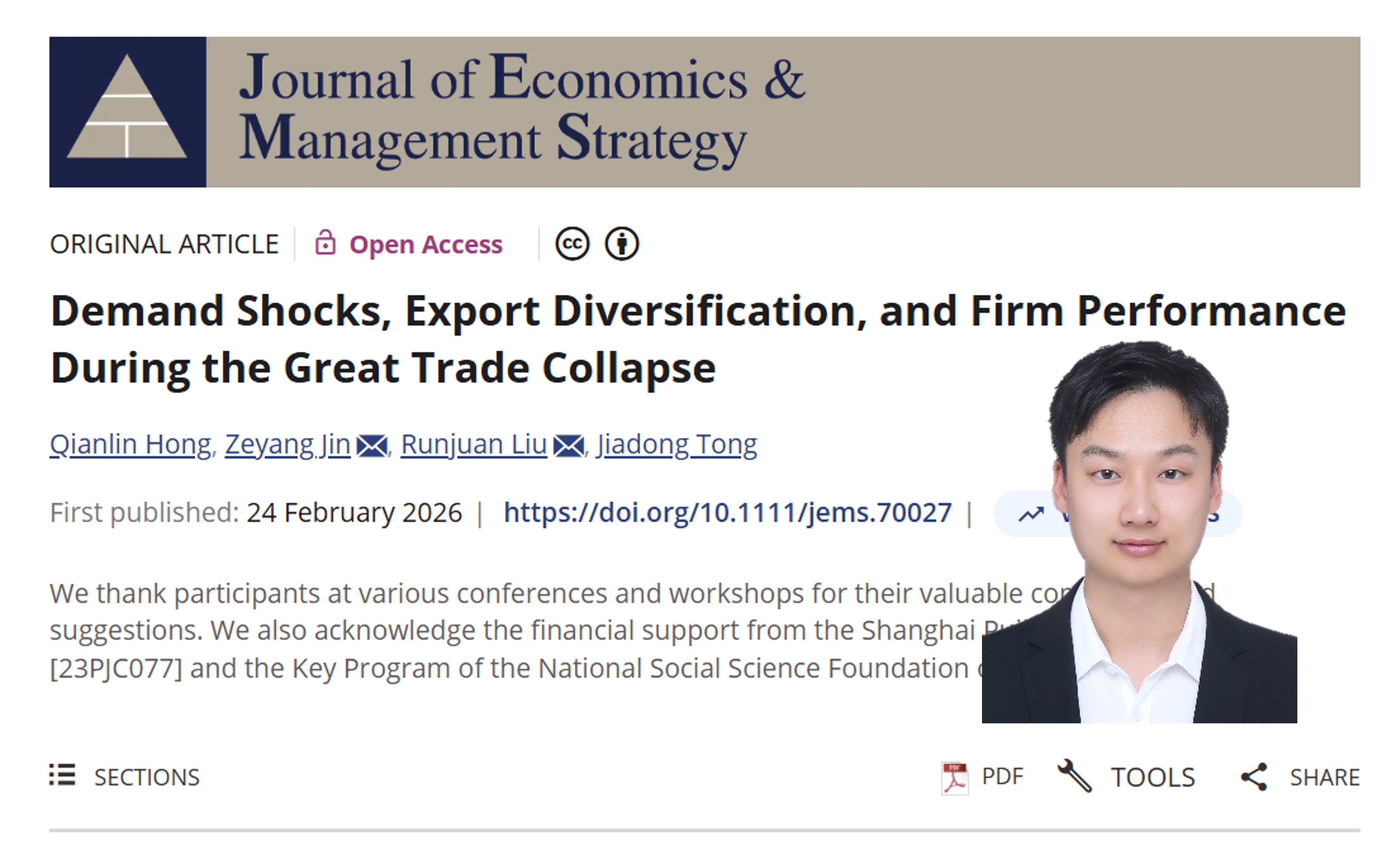 近日,上海师范大学商学院副教授金则杨作为共同通讯作者,与深圳证券交易所洪倩霖、加拿大阿尔伯塔大学刘润娟教授以及南开大学佟家栋教授(作者以字母顺序排序)的合作论文《Demand Shocks, Export Diversification,and Firm Performance During the Great Trade Collapse》已正式被国际经济学与管理学顶尖期刊《Journal of Economics & Management Strategy》(简称JEMS)录用并在线发表。 《Journal of Economics & Management Strategy》由哈佛商学